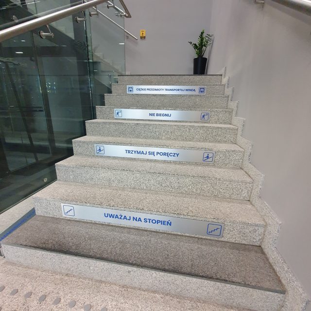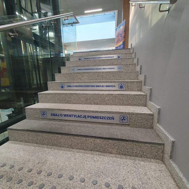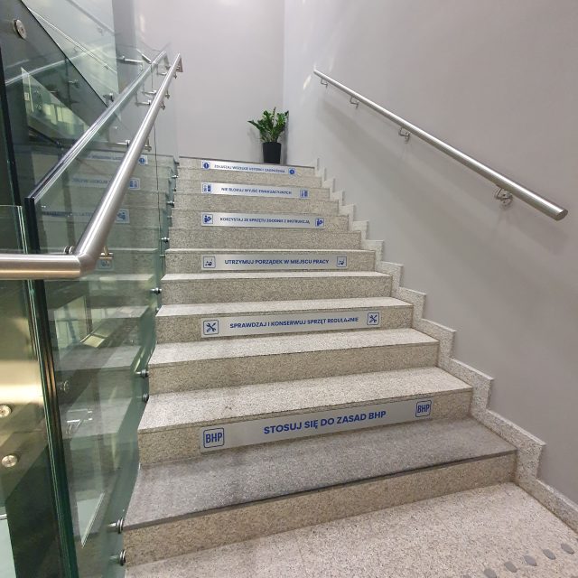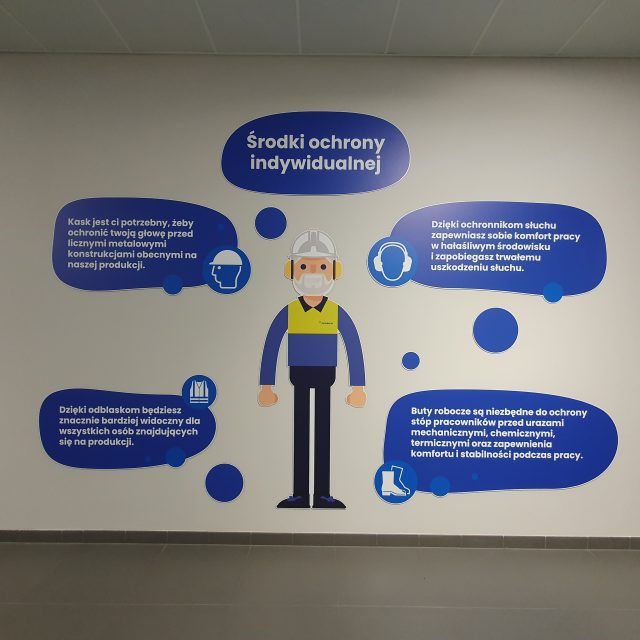 ✔ introducing occupational health and safety markings – on stairs, walls and in the form of a large information graphic at the entrance to the hall, regarding the use of personal protective equipment (helmet, shoes, clothing, headphones).
