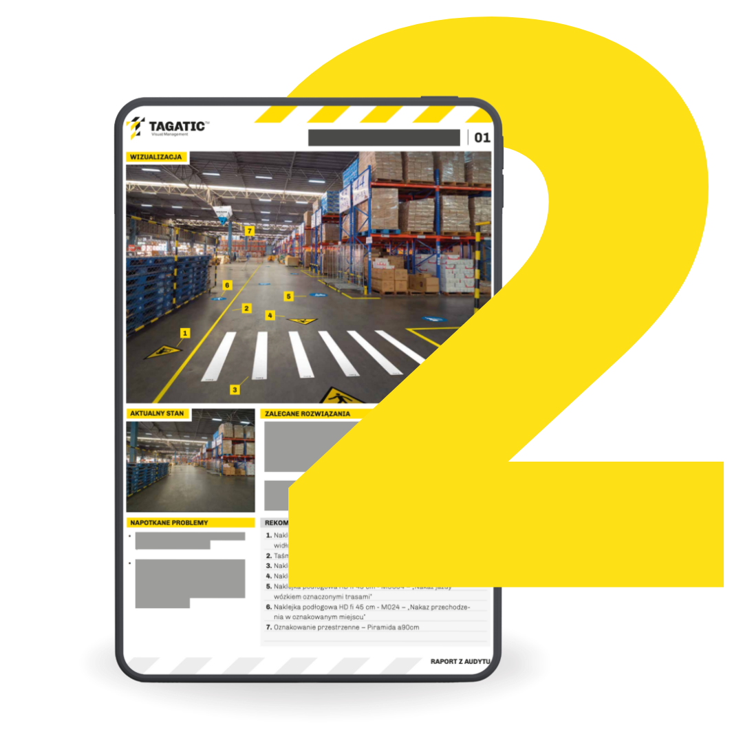 W zależności od wybranej formy montażu (samodzielnie lub przez naszych specjalistów) przesyłamy wraz z materiałami instrukcję do samodzielnej instalacji oznakowania albo umawiamy się na termin i kompleksowo wdrażamy system Tagatic Visual Management.