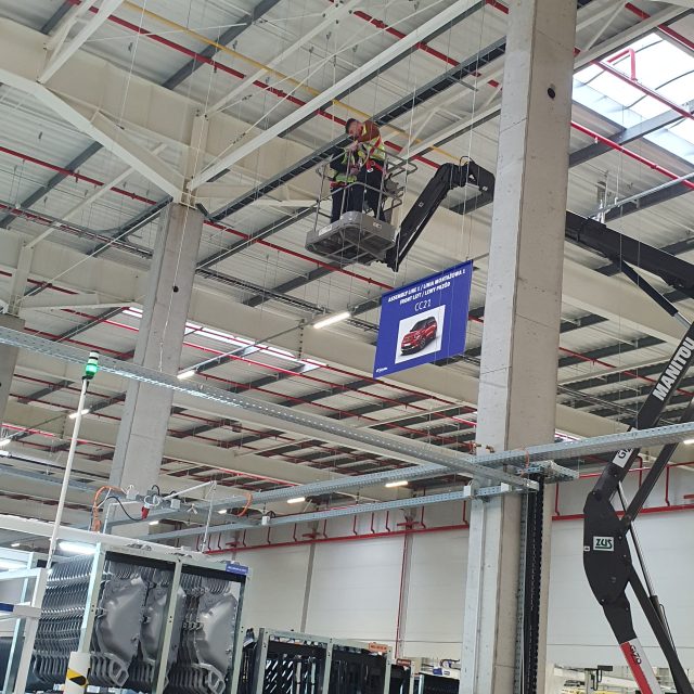 W celu usprawnienia nawigacji wewnątrz hali wprowadzono tablice podwieszane z wyraźnym oznaczeniem sektorów i działów. Ich rozmieszczenie umożliwia szybkie zlokalizowanie odpowiednich stref produkcyjnych i magazynowych, co skraca czas operacyjny i zmniejsza liczbę błędów w komunikacji między działami.