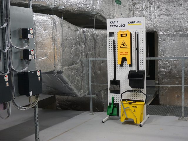 Dobre wdrożenie 5S widać na pierwszy rzut oka: oznaczone miejsca składowania, wyraźne strefy komunikacyjne na podłodze, tablice z informacją o stanie stanowiska.